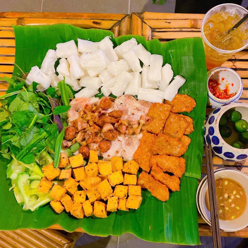 It’s not only attractive by the rustic dishes, close to daily human life, but the vermicelli with fried tofu & shrimp paste also attracts visitors by its simple presentation, eye-catching. The pressed vermicelli leaves are cut into pieces, arranged evenly on top of a basket lined with green banana leaves. Combine with crispy fried beans, even yellow and a bit of pork, rice bowl and pork with some raw vegetables. And of course indispensable bowl of shrimp sauce with a little lemon and spicy chili is so fragrant that visitors can hardly resist.
